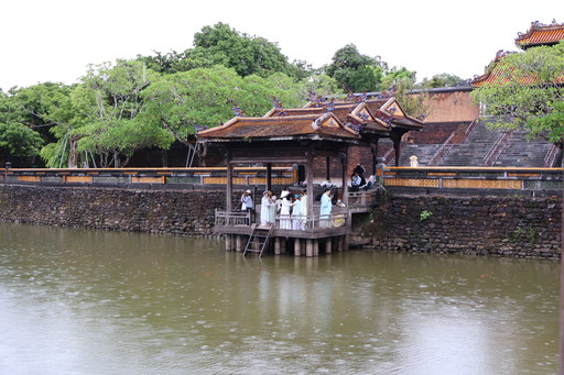 今までの陵墓では見なかった、伝統的な衣装着用(多分レンタル)のベトナムの若者たち。雨だから、大変そう。