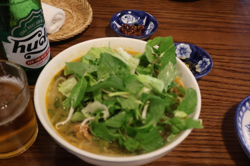 ブンチャーと同じく、米粉の麺(ブン)を使いながらも、こちらは牛肉やピリ辛スープが入っています(ブンチャーはつけ麺タイプで、炭火焼の豚肉や、つくねが入っていました)。