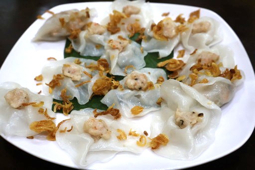 お待ちかねのホワイトローズ(70,000ドン)を注文。ホワイトローズは、エビの蒸し餃子にフライドオニオンがまぶしてある料理で
