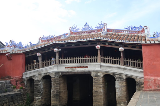 立派な瓦屋根付きの橋で、横から見るとこんな感じ。20,000ドン紙幣の絵柄として採用され、ベトナム人にもよく知られています。日本人が建設したので、日本橋の別名が付いたようですが、日本人の私から見ると、中華風でエキゾチックな感じもします。