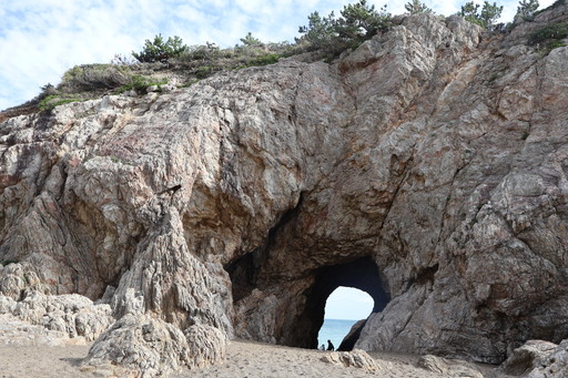 チャートと呼ばれるこの岩はとても硬いのですが、断層によってもろくなった部分があり、それが波に侵食されて、このような門ができたそう。