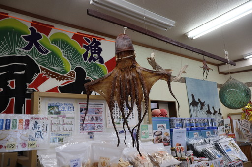 中にはタコの干物が! 大漁旗も飾られていて、写真映えすることこの上なし。ただ、肝心のタコの干物はなかなか私たちの予想を上回っている値段で、手が出しづらい。
