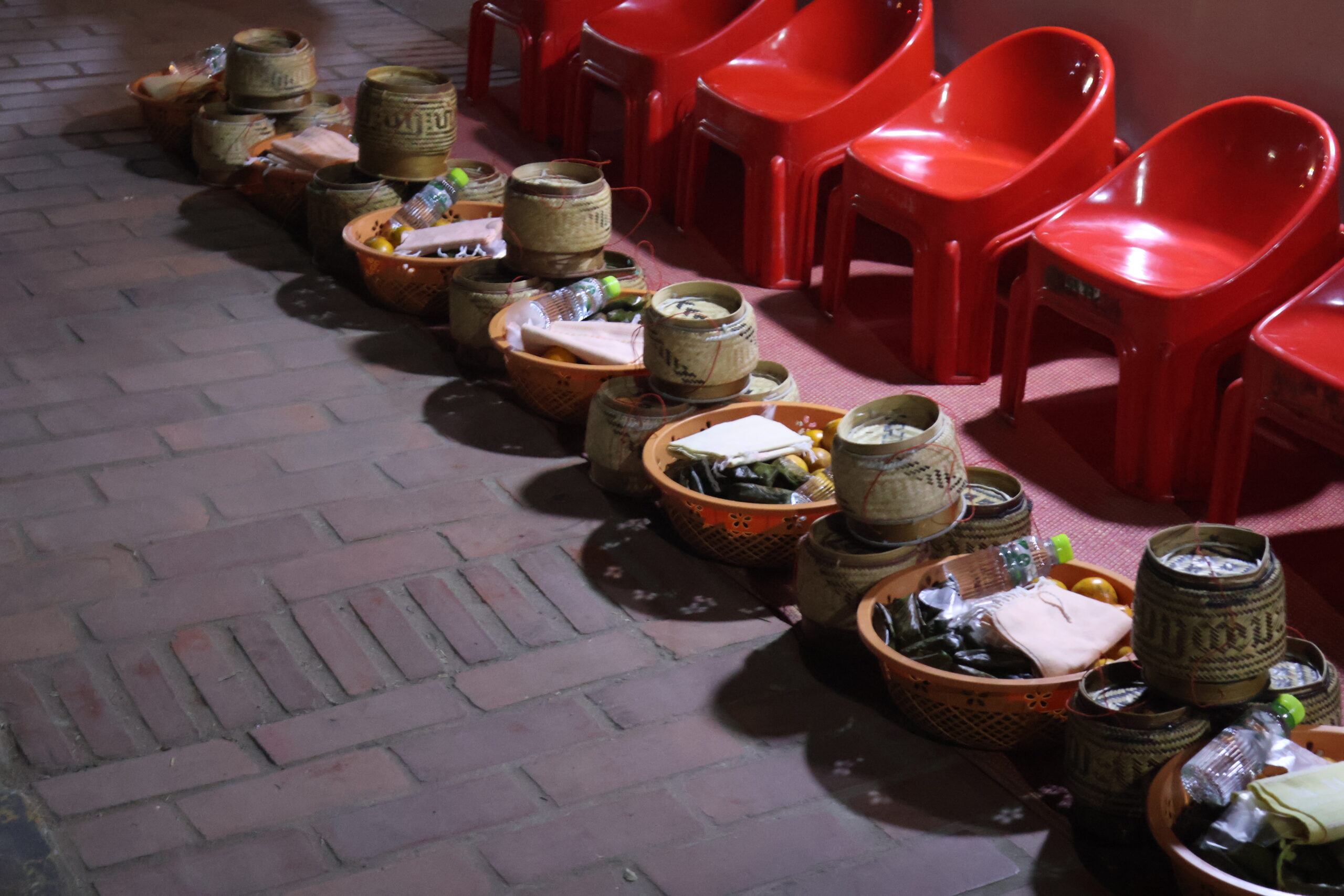 昨夜訪れたナイトマーケットのフードコートエリア近くの交差点に行くと、路上にびっしりと、背の低いプラスチック製の椅子が並び、その前にはお供えセットが置かれていました。小さな竹製の籠「ティップ・カオ」(中には糯米ごはん)、もう1つの容器にはお菓子が入っているのかな?