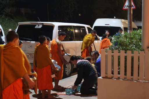 2025年12月30日(火)、ルアンパバーン2日目です。夜明け前から行われる僧侶の托鉢(たくはつ=僧侶が信者からのお布施を求めて町を練り歩く行事)を見学するため、まだ皆が寝静まっている暗い宿を出て、5:30頃、昨夜ナイトマーケットが開催されていた繁華街にやってきた私たち。