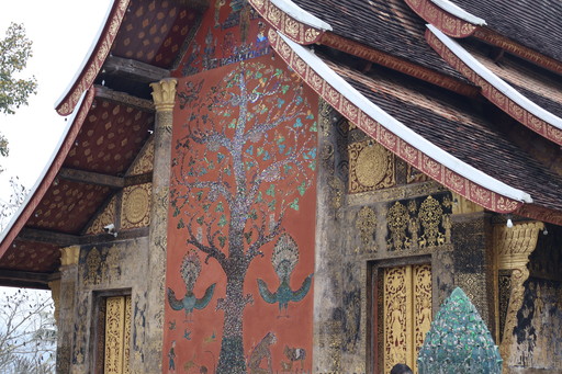 外に出て、本堂の裏手に出てみました。日本出発前、ルアンパバーンのYouTubeをいくつか見たのですが、その中で、ワット・シェントーン本堂背面の壁に世界樹が描かれていると知り、見てみたかったのです。確かに「世界樹」はありました。