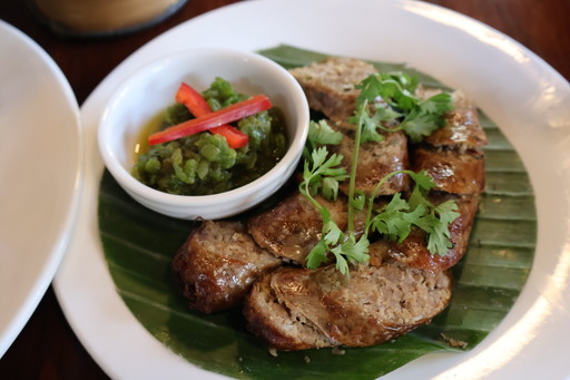 辛いのが苦手な私は、手作りのラオス風豚肉ソーセージ(71,000キープ=511円)。小皿に入っているのは、バナナチリペッパー(マイルドな唐辛子)とスプリングオニオン(青ネギ)から作られたチャツネ(ペースト状ソース)。マイルドな唐辛子ですが、やはり少しは辛い。でもソーセージは美味しくて、大正解。