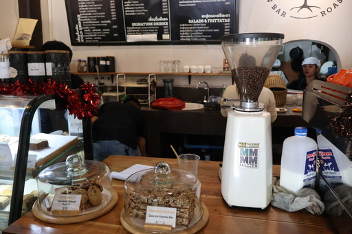 この店では、環境への配慮や農家支援にも取り組み、ルアンパバーン郊外で良質のコーヒー豆を栽培しているようで、コーヒー豆の販売もしています。私たちはルアンパバーン滞在初日にコーヒー粉を購入してしまったので、今回はご縁がなかったのですが、この店のコーヒーを買うという選択肢もあったなと思いました。