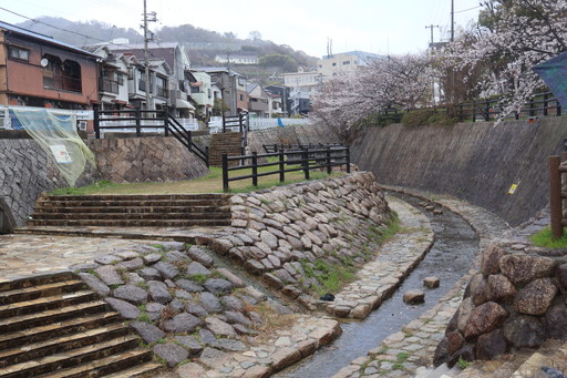 小泉八雲一家は、1895(明治28)年末に、「神戸市中山手通7丁目番外16」に移り住みました。その2年前に熊本で誕生した夫妻の長男・一雄によると、「山手の異人館前を流れる宇治川で、ハーンと一緒に笹舟や玩具を流したりして遊んだ」とのこと。今は影も形もありませんが、昔は異人館がたくさん建っていたのでしょうか。