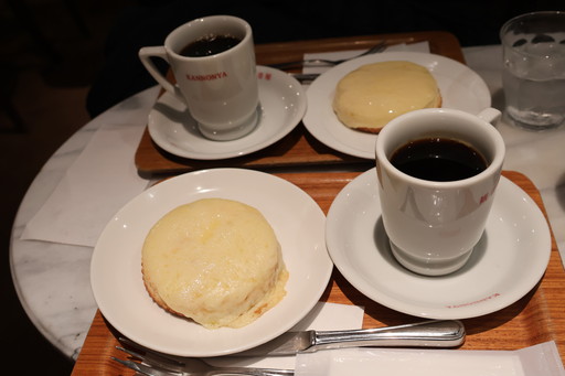 この店の名物は、デンマークチーズケーキ。一般的なチーズケーキとは異なり、オーブントースターで温めた、熱々とろとろのチーズ(塩気のあるデンマークチーズ)が味わえます。普通のチーズケーキとかなり違うので好き嫌いもあるだろうし、テイクアウトもあるのですが(大阪駅でも売られている)、やはり店で食べるのが一番美味しいという評判もあります。まぁ一度話の種に神戸名物をぜひ味わってほしいなと、観音屋ファンの兵庫県民として、声を大にして宣伝するところです。チーズケーキとコーヒーのセット(2人で税込み1,696円)を美味しく頂きました。