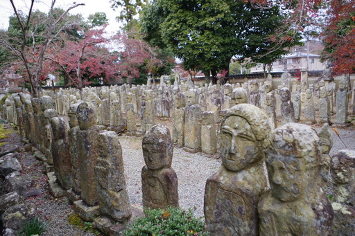 紅葉の境内を進んでいくと、境内北側でたくさんの石仏群がお出迎え。