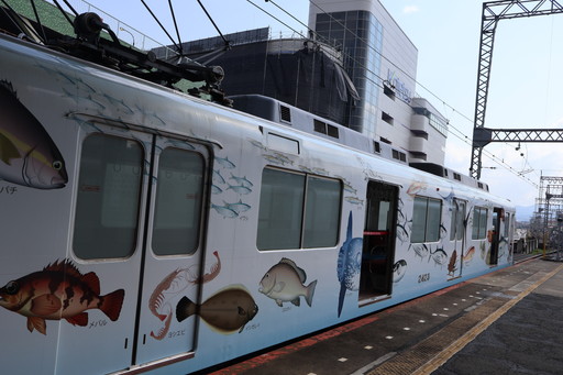 とても可愛い、子供が(そして大人も)喜びそうなラッピング車両だったのです。親切なことに、魚の名前もカタカナで書かれています。間違えて乗ろうとする人がいても、不思議ではないなと思いました。