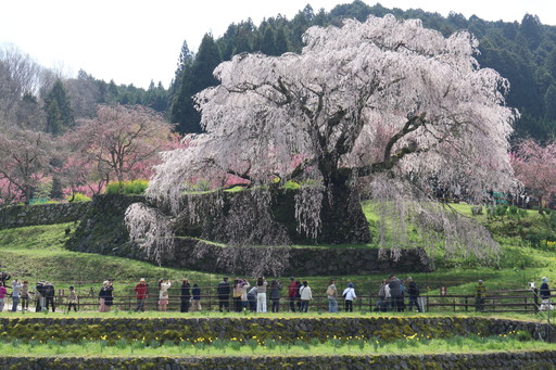 遠くに桜が見えてきました。あの中心の桜が、目指す又兵衛桜のようです。桜の木が1本だけあるのではなく、桜(ソメイヨシノ)や花桃も咲いていて、ピンクの濃淡と山の緑がとても春らしい景色でした。まさに「懐かしい日本の里山」という風情です。